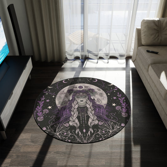 Lunar Goddess & Wildflowers Round Chenille Rug for Meditation, Living Room, and Bedroom – Full Moon and Dark Occult Design