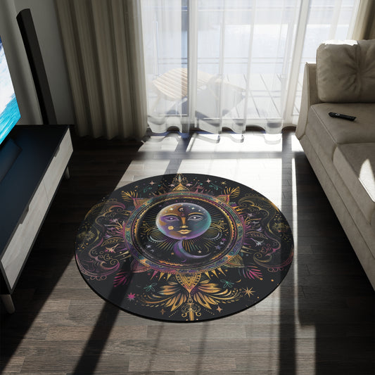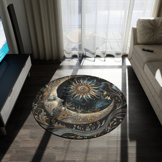 Crescent Moon & Sun Chenille Round Area Rug, Dark Cottagecore Folk Design, Art Nouveau Bedroom, Living and Meditation Space Decor