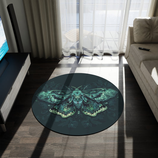 Green Lunar Moth Chenille Round Area Rug, Moon Lover Design, Vibrant Emerald Bedroom, Living and Meditation Space Decor