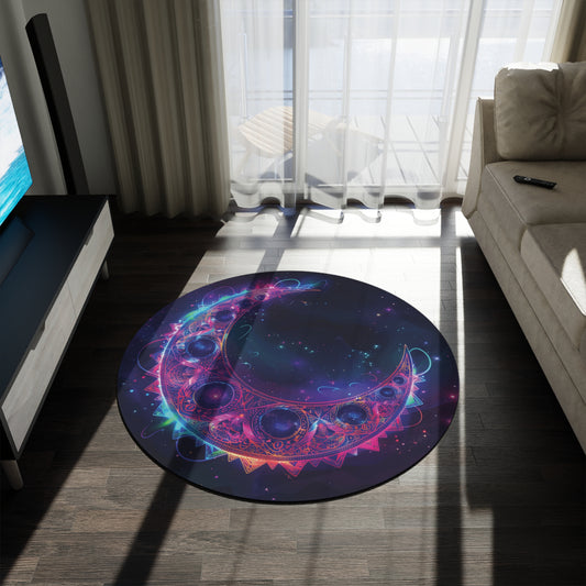 Electric Crescent Moon Chenille Round Area Rug, Vibrant Neon Glowing Lunar Aesthetic for Home