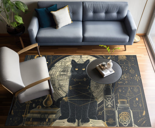 Black Cat & Spell Books Polyester Chenille Area Rug (3 Sizes), Mystical Sacred Geometry Design, Dark Occult Aesthetic Room Decor