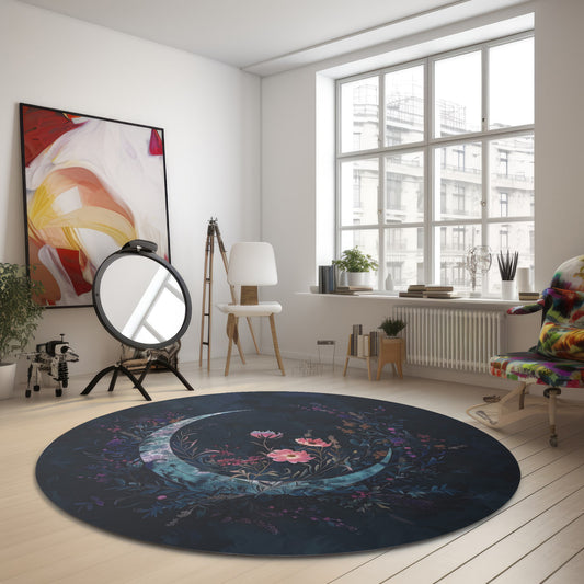Crescent Moon & Wildflower Mandala Chenille Round Area Rug, Dark Occult Aesthetic, Lunar Lover Bedroom, Living Room and Meditation Space