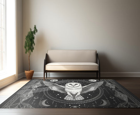 White Barn Owl Polyester Chenille Area Rug (3 Sizes), Sacred Geometry Aesthetic, Dark Occult Bedroom, Living Room & Dorm Room Decor