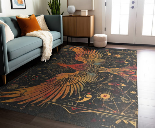 Rising Phoenix Polyester Chenille Area Rug (3 Sizes), Sacred Geometry Aesthetic, Dark Occult Bedroom, Living Room & Dorm Room Decor