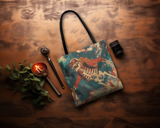 Sky Diving Skeleton Polyester Tote Bag (Double Sided), Dark Cottagecore Design, Gothic Street Art Style Fashion, 3 Sizes, Black Handles