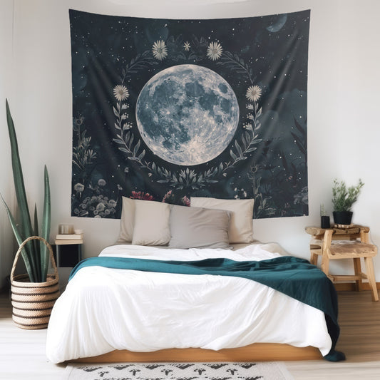 Full Moon & Wildflower Indoor Wall Tapestry, Dark Cottagecore Design, Lunar Lover Gift, Enchanting Decor