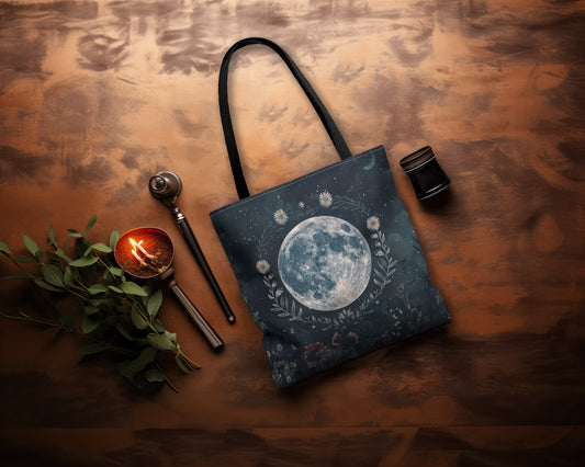 Full Moon & Wildflower Double-Sided Tote Bag – Dark Cottagecore Elegance with Black Handles, Perfect for Moon Admirers