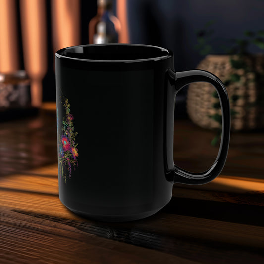 Celestial Garden 15oz Black Ceramic Mug, Cosmic Bloom Aesthetic, Moonlit Floral Symphony, Starlit Wilderness Design, Galactic Botanical Drinkware