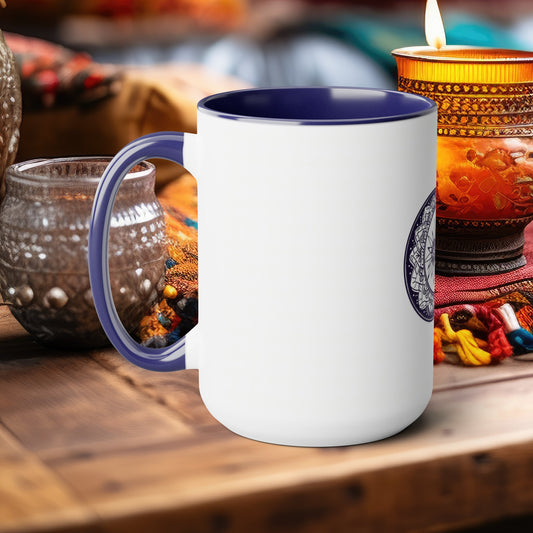 Bohemian Mandala Moon 15oz Coffee Mug with Vibrant Blue Handle & Interior, Intricate Crescent Design for Relaxing Evenings, Ideal Gift