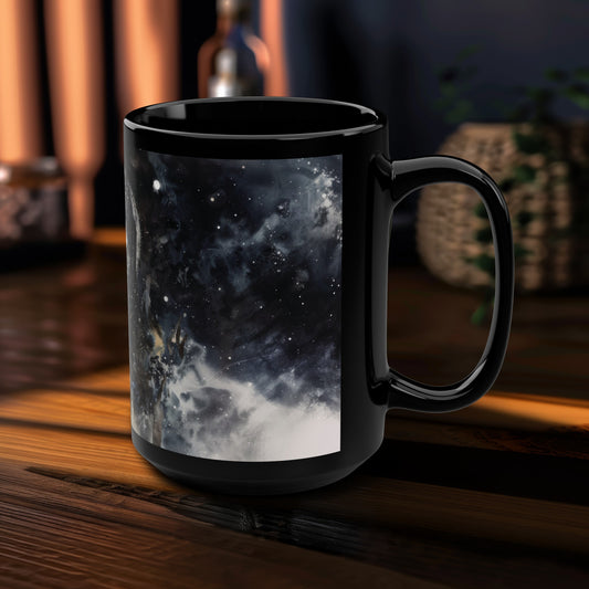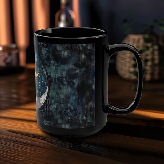 Selene's Moonlit Reverie 15oz Black Ceramic Mug, Goddess of the Moon Design, Celestial Elegance, Nocturnal Charm Sipware