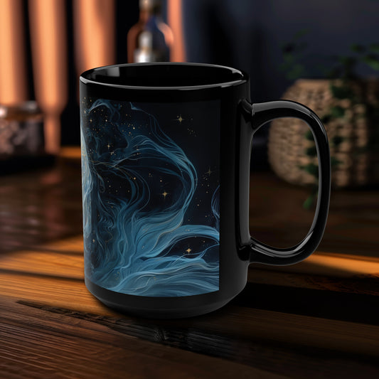 Nyx’s Nocturne 15oz Black Ceramic Mug, Greek Goddess of Night Design, Starlit Elegance, Cosmic Serenity Sipware