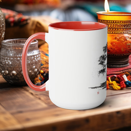 Red Rising Sun Bonsai 15oz Mug, Traditional Chinese Art with Red Accents, Inspiring Tea and Coffee Cup for Home and Office