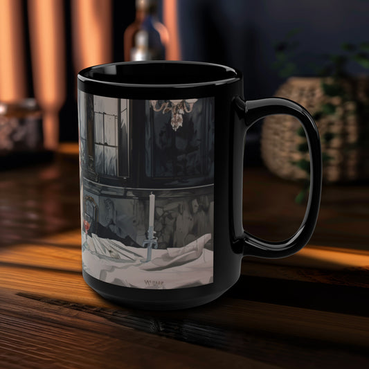 Persephone's Repose 15oz Black Ceramic Coffee Mug, Mythical Elegance, Refined Morning Rituals, Artful Tabletop Statement
