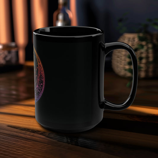 Buddha's Serene Mandala 15oz Black Ceramic Mug, Neon Enlightenment Motif, Spiritual Radiance, Zen Circle Design, Vibrant Meditation Drinkware