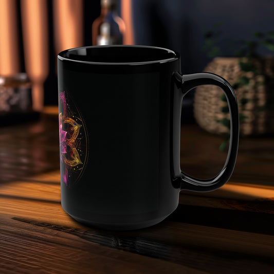 Luminous Lotus 15oz Black Ceramic Mug, Vibrant Energy Motif, Radiant Floral Mandala, Cosmic Bloom Design, Ethereal Color Spectrum Drinkware
