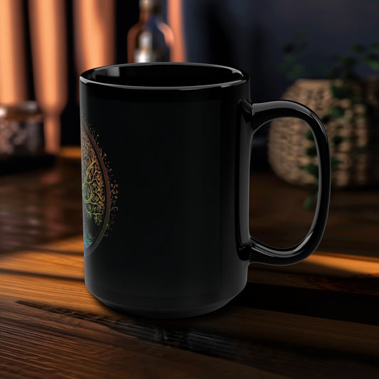 Mystic Arbor 15oz Black Ceramic Mug, Enchanted Tree of Life Motif, Magical Spectrum Design, Folklore Forest Decor, Radiant Nature Drinkware