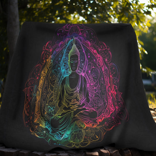 Buddha's Serene Mandala Double-Sided Throw Blanket, Neon Enlightenment Motif, Spiritual Radiance, Zen Circle Design, Vibrant Meditation Art