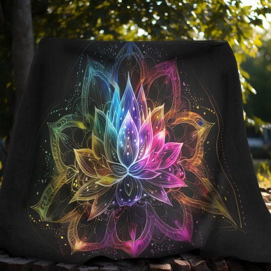 Luminous Lotus Double-Sided Throw Blanket, Vibrant Energy Motif, Radiant Floral Mandala, Cosmic Bloom Design, Ethereal Color Spectrum Art