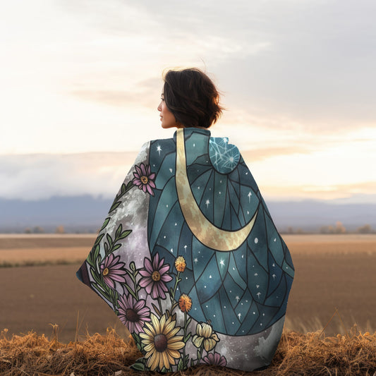 Nocturnal Blossom & Crescent Moon Stained Glass Double-Sided Throw Blanket, Starlit Floral Elegance, Soft Warmth for Evening Unwinding