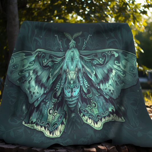 Lunar Moth Double Sided Throw Blanket, Vibrant Emerald Design, Neon Aesthetic, Mystical Magical Bedroom, Living, and Dorm Room Decor