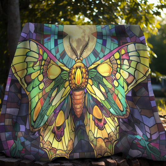Illuminated Sunset Moth & Crescent Moon Stained Glass Double-Sided Throw Blanket, Luminous Winged Beauty, Luxurious Comfort for Restful Slumber