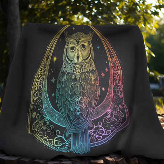 Lunar Sentinel Owl Double-Sided Throw Blanket, Moonlit Avian Emblem, Cosmic Wisdom Design, Starry Night and Lunar Motif, Mystical Moonlit Art