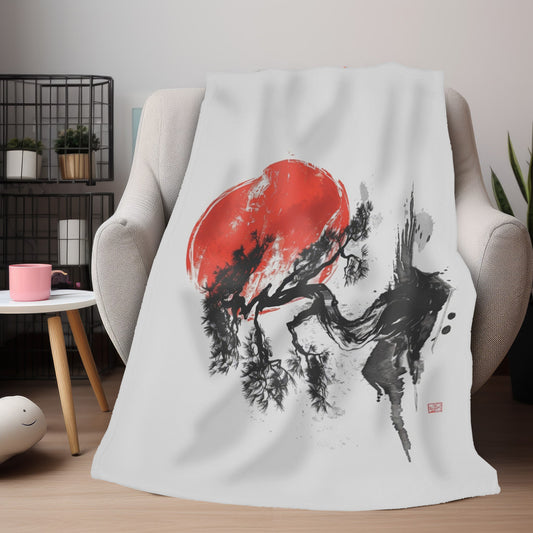 Traditional Chinese Bonsai & Red Sun 2-Sided Throw Blanket, Elegant Ink Wash Style Art, Serene Zen Decor for Home, Bedroom, Living Space, and Dorms