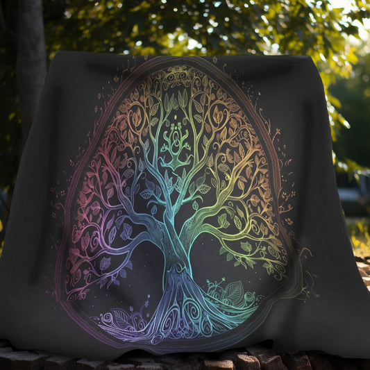 Mystic Arbor Double-Sided Throw Blanket, Enchanted Tree of Life Motif, Magical Spectrum Design, Folklore Forest Decor, Radiant Nature Art