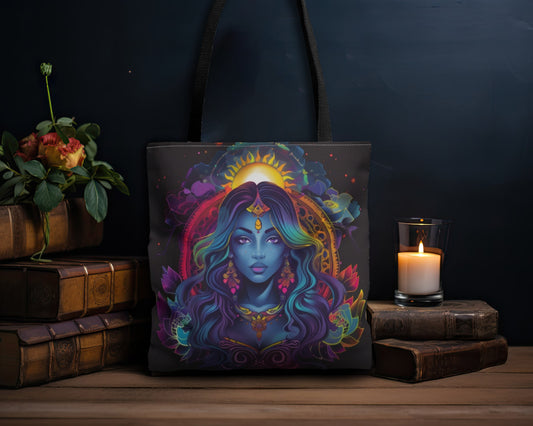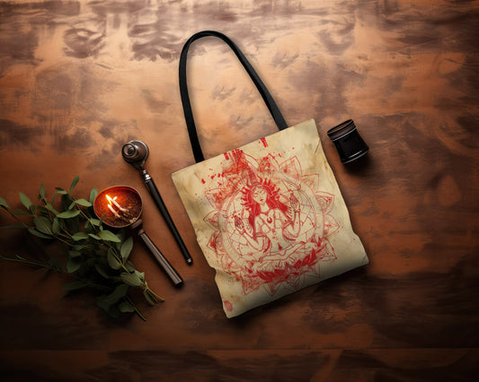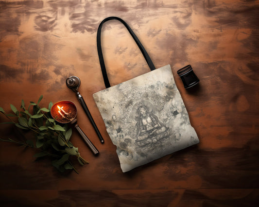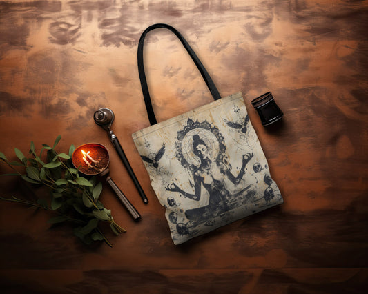 Death Goddess Polyester Tote Bag (Double Sided), Zen Nature Aesthetic, Sacred Geometry Style Fashion, 3 Sizes, Black Handles