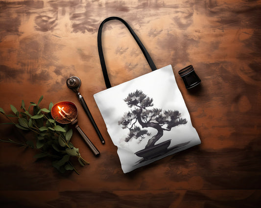 Chinese Ink Style Bonsai Tree Double Sided Tote Bag, Simple Minimalist Aesthetic, Zen Nature Fashion Style, Black Handles, 3 Sizes