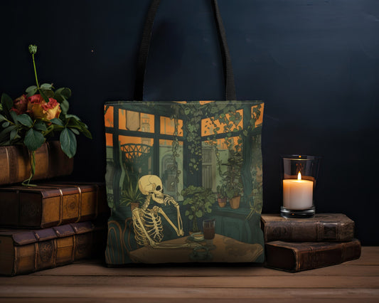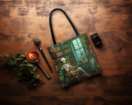 Skeleton Reading in Library Polyester Tote Bag (Double Sided), Cottagecore Design, Gothic Folk Style Fashion, 3 Sizes, Black Handles