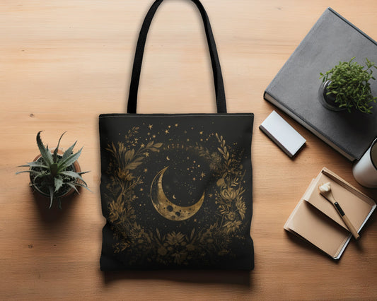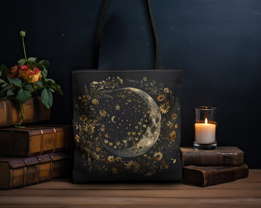 Gold Crescent Moon & Wildflower Mandala Polyester Tote Bag (2-Sided), Dark Cottagecore Design, Witchy Style Fashion, 3 Sizes, Black Handles