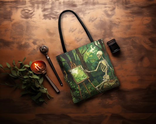 Skeleton Painting Landscape Polyester Tote Bag (Double Sided), Dark Cottagecore Design, Gothic Folk Style Fashion, 3 Sizes, Black Handles