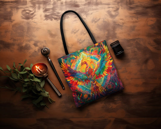 Psychedelic Rainbow Phoenix Double Sided Tote Bag, Street Art Aesthetic, Vibrant Colorful Fashion Style, 3 Sizes, Black Handles