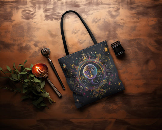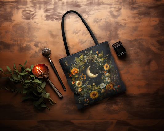 Faded Crescent Moon & Wildflower Mandala Polyester Tote Bag (2-Sided), Dark Cottagecore Design, Witchy Style Fashion, 3 Sizes, Black Handles