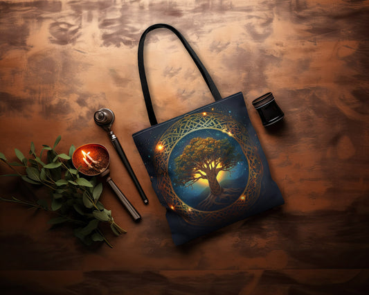 Celtic Tree of Life Mandala Double Sided Tote Bag, Ancient Occult Aesthetic, Folk Nature Fashion Style, 3 Sizes, Black Handles