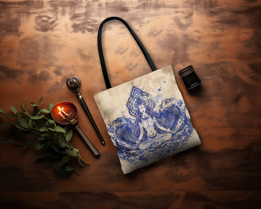 Water Goddess Polyester Tote Bag (Double Sided), Zen Nature Aesthetic, Sacred Geometry Style Fashion, 3 Sizes, Black Handles