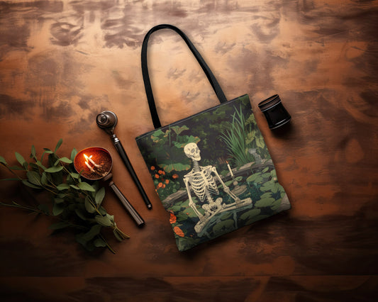 Skeleton Meditating in Zen Garden Polyester Tote Bag (Double Sided), Cottagecore Design, Gothic Folk Style Fashion, 3 Sizes, Black Handles