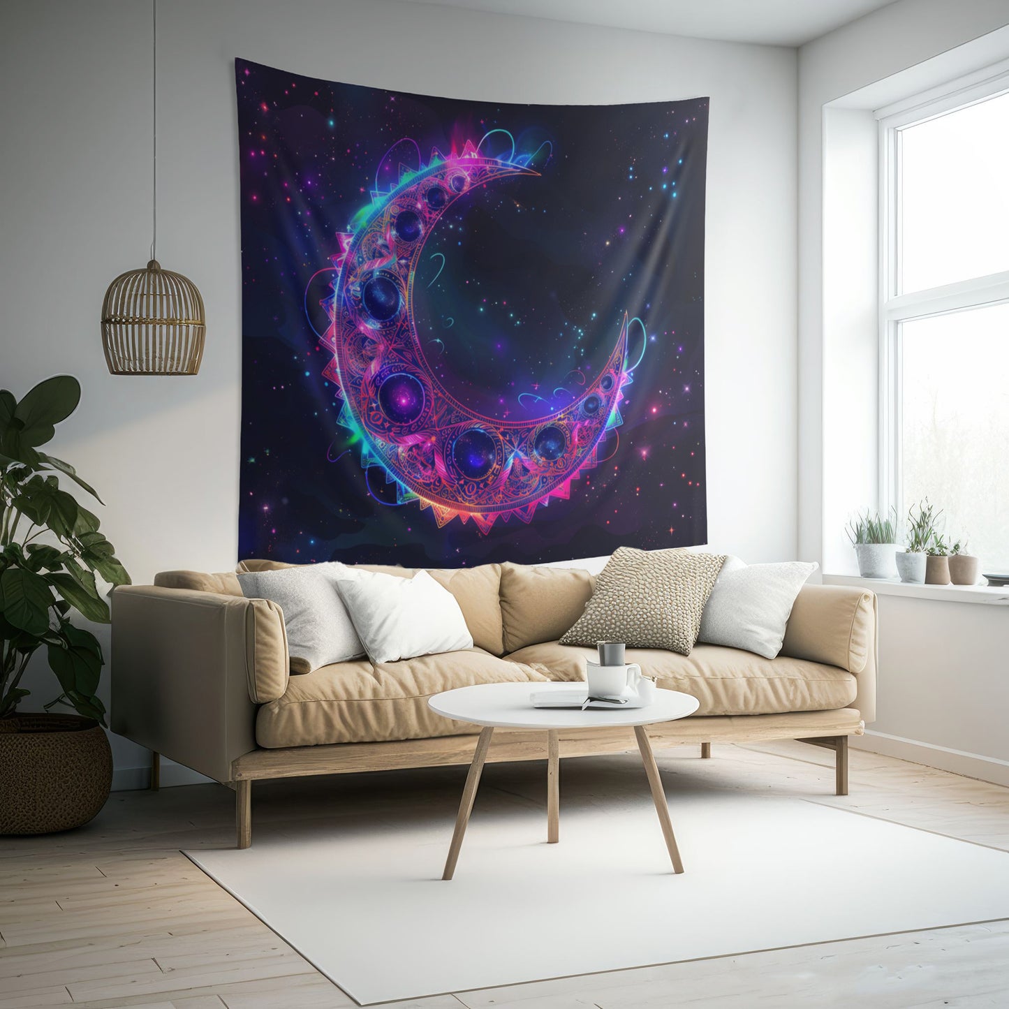 Vibrant Crescent Moon & Electric Mandala Wall Tapestry – Cosmic Harmony Decor for Home & Dorm